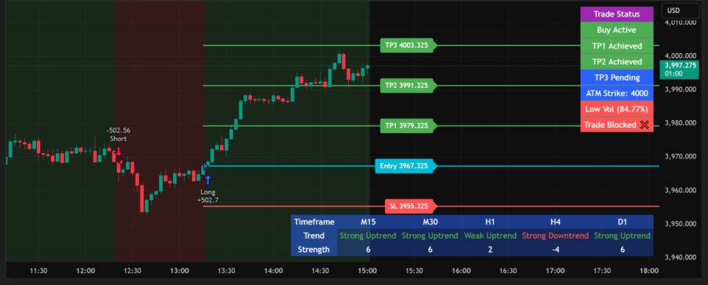 The Trading Signal Indicator, in addition to providing trades, provides you with complete live market data in one place, allowing you to maximize profits. On the penal, you'll see which trades are ongoing, how many targets have been collected or are pending. What strike price should you choose? What is the volume in the market? Whether the trade is allowed or blocked. After that, it tells you the time frame and trade strength (15 min, 30 min, 1 hour) whether the market is bearish or bullish, strong bearish or strong bullish. This is what makes this indicator special.